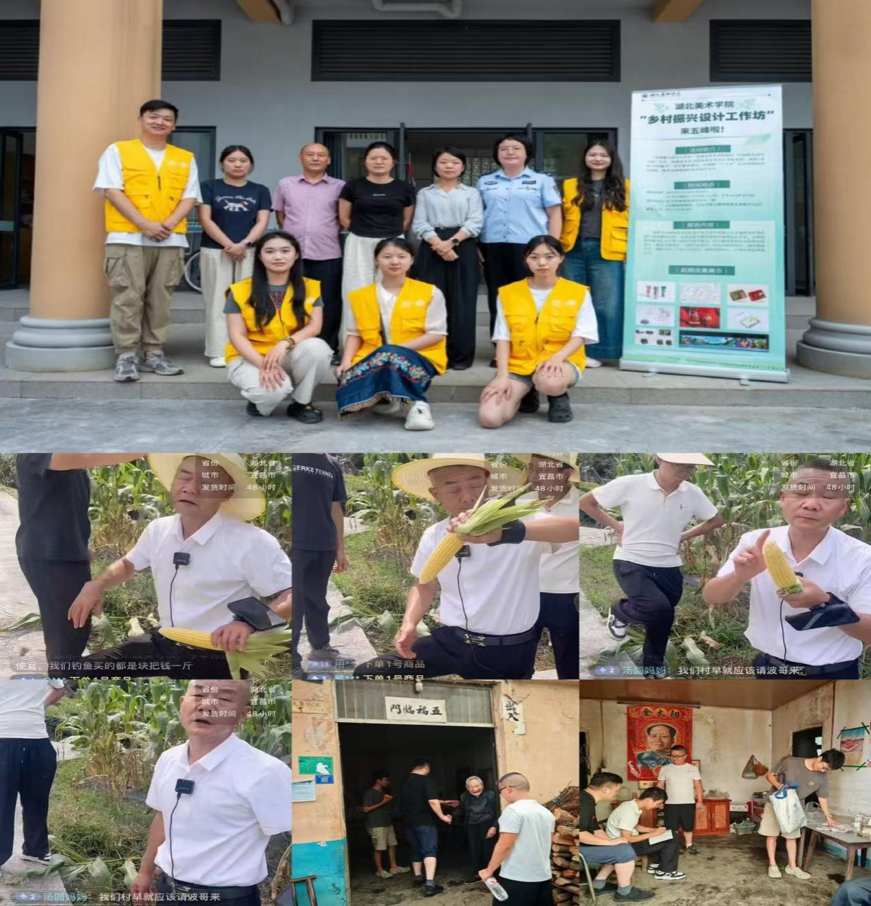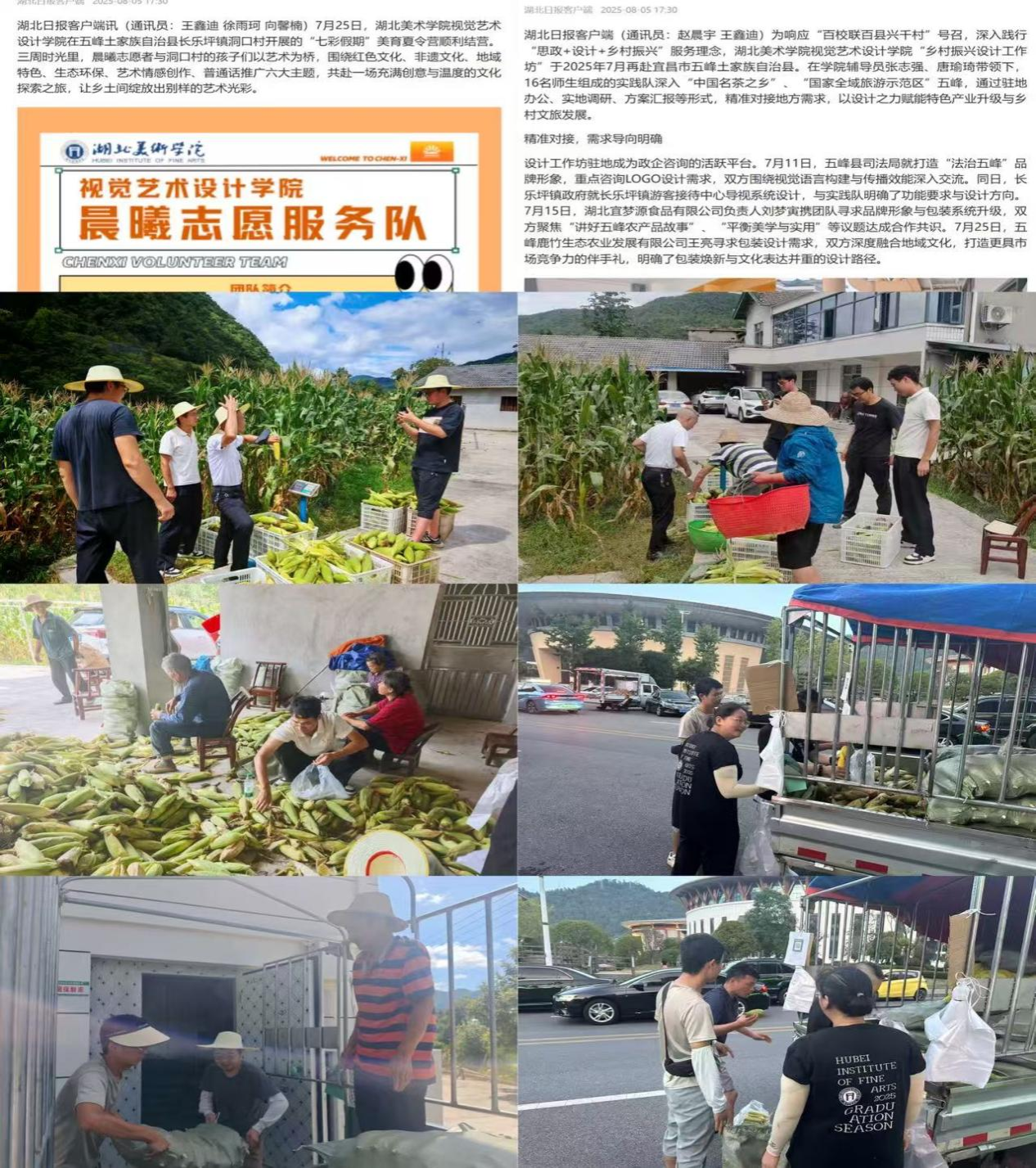 工作队充分发挥学校专业优势,积极推动艺术设计与乡村发展深度融合。本月,在湖北日报客户端发表3篇宣传稿,报道“乡村振兴设计工作坊”和美育夏令营活动,展现设计赋能产业、美育浸润乡村实践成果。同时,工作队联合本土助农主播“波哥农产品甄选”(李金波)开展“田间直播·兴农助销”活动,线上+线下销售甜糯玉米1700斤,并多次参与农产品分拣、包装及运输工作,推动“快递进村”政策落地,有效提升农产品附加值和市场竞争力。在产业调研中,工作队深入绿粽生产基地、烤烟基地等,结合设计包装与品牌提升需求,提出专业建议,助力特色产业延链增效。