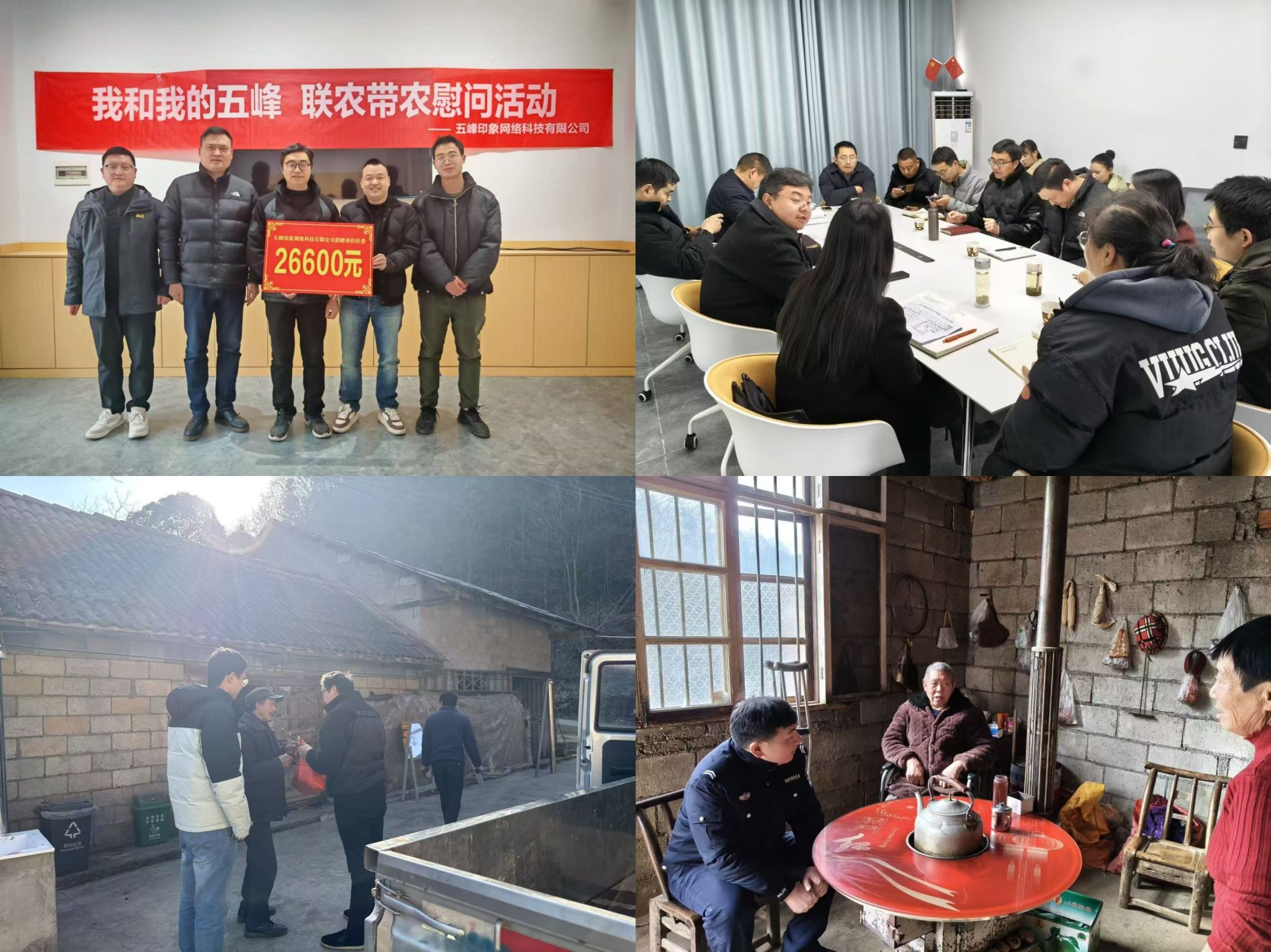 产业发展方面,工作队远赴甘沟村协助完成农副产品集体采购,协助村“两委”规划拟建养老服务综合体,并与县委社会工作部专题研讨“养老+慈善”融合模式,精心谋划民生产业项目。同时,积极链接各类资源,在“联农带农慰问活动”中接收五峰本地企业帮扶资金26600元,接收学校影视动画学院捐赠的会议平板一体机,有效提升村委会信息化办公水平;主动参与镇农产品加工存储中心规划,助力区域产业高质量发展。民生服务上,工作队以“暖冬行动”为抓手,累计走访脱贫户、监测对象等各类农户超150户次,实现重点群体全覆盖。走访过程中,细致核查“两不愁三保障”、饮水安全等落实情况,重点排查冬季取暖安全隐患,宣传用火用电知识,督促群众及时缴纳医疗保险;联合多部门走访2名在册精神障碍患者,专程赴外地看望务工的监测对象,同时协助开展基层志愿服务专题调研,为优化“童伴之家”服务品牌取经学习,切实筑牢防返贫防线,不断提升群众的幸福感和满意度。